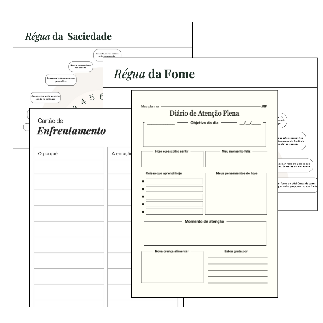Não é só teoria. Você recebe atividades guiadas para aplicar imediatamente na sua rotina: registros de pensamentos, técnicas de manejo emocional, estratégias para lidar com gatilhos e passos simples para transformar sua relação com a comida de forma concreta.